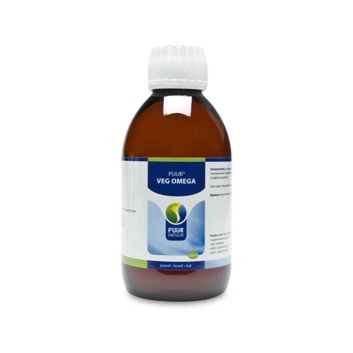 Puur Veg Omega enthält die pflanzlichen essentiellen Fettsäuren 3, 6 und 9 im optimalen Verhältnis, so dass die Fettsäuren gut aufgenommen werden. Omega-3- und Omega-6-Fettsäuren haben eine positive Wirkung auf den Körper, wenn sie im richtigen Verhältnis angeboten werden. Puur Veg Omega hilft, Muskeln und Gelenke geschmeidig zu halten und trägt zu einem guten Zustand von Haut und Fell bei.